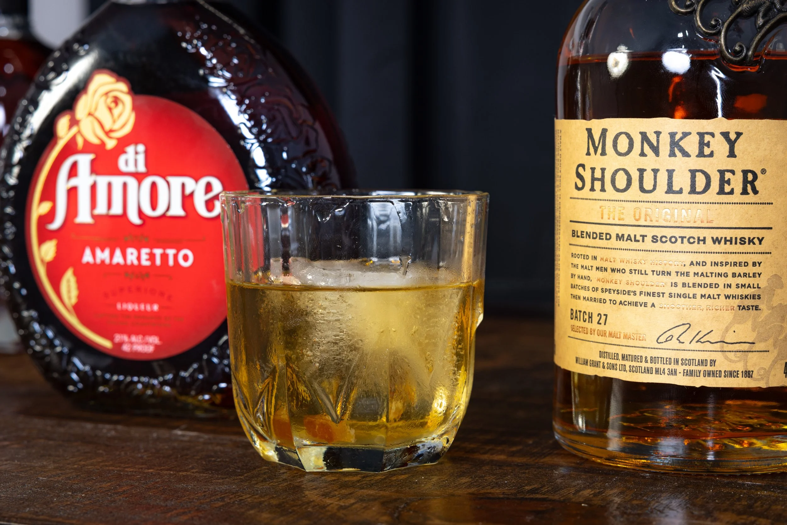Pour the Scotch: Add 1 ½ oz of your favorite Scotch whisky. A smooth, medium-bodied Scotch pairs well with the Amaretto's sweetness.